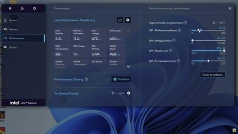 Prvně vyzkoušel Offset Mode, který navyšuje frekvenci současně se zvyšováním napětí, Lock Mode pak dovoluje nastavovat manuálně napětí a frekvenci (nicméně posuvník pro nastavení napětí GPU nefunguje). Maximální frekvence dosáhla 2450 MHz, nicméně Arc Control má ještě posuvník funkce GPU Performance Boost. Ta ale nefunguje tak, jak by se dalo čekat, a 30% navýšení v softwaru se projevilo jen 10% navýšením taktu na 2696 MHz. Pamětem není možné měnit napětí vůbec.